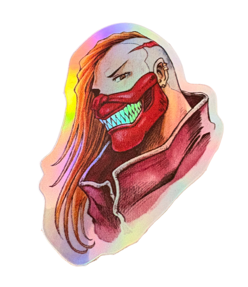Sticker holográfica da Yana com acabamento iridescente que muda na luz. Uma arte marcante com olhar cortante e sorriso impossível — perfeita para colecionar e personalizar seus itens.